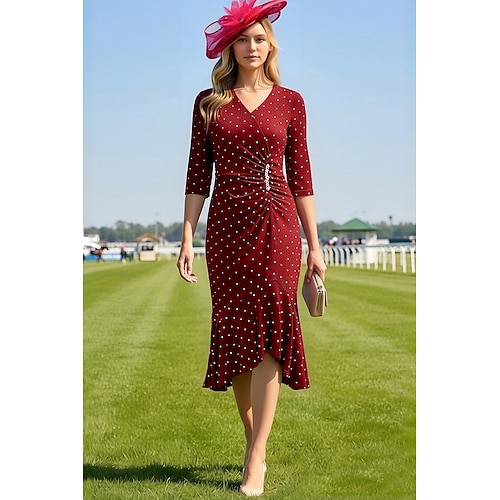 Abito da Festa a Sirena Tromba Asimmetrico Lunghezza Te Abito da Cocktail Abito da Invitata al Matrimonio Abito per Madre della Sposa Maniche Lunghe Scollatura a V Elegante Vintage Festa con Pieghe e