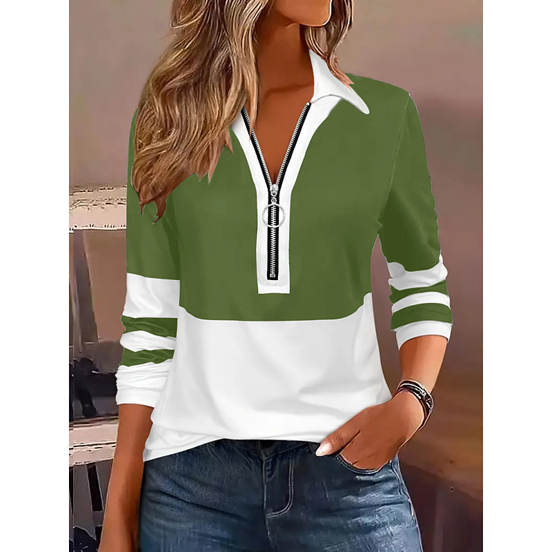 Women's Blouse Geometric Stylish Casual Long Sleeve Shirt Collar Regular Tops Daily Patchwork Zipper Black Wine Light Brown Blue Green Spring Fall