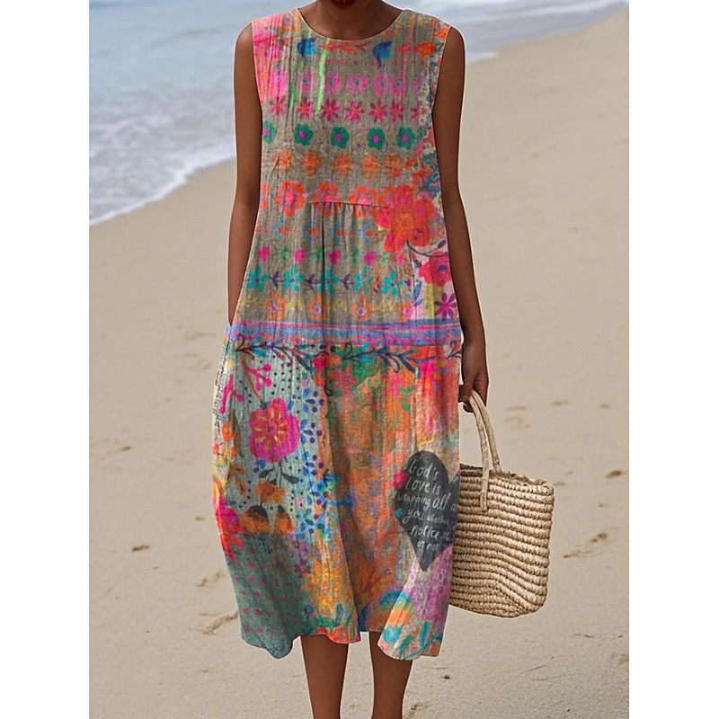 Women's Midi Dress Sundress Shift Dress A Line Dress Vacation Casual Boho Party Going out Beach Loose Fit Floral Graphic Sleeveless Crewneck Light Yellow Deep Green Gray Green Orange red Summer Spring