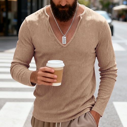 Herren T Shirt T-Shirt Langarmshirt Langarm V Ausschnitt Frühling Herbst Einfarbig Mode Streetwear Lässig Klassisch Outdoor Urlaub Straße Blau Weinrot Aprikose Top T-Shirt für Herren