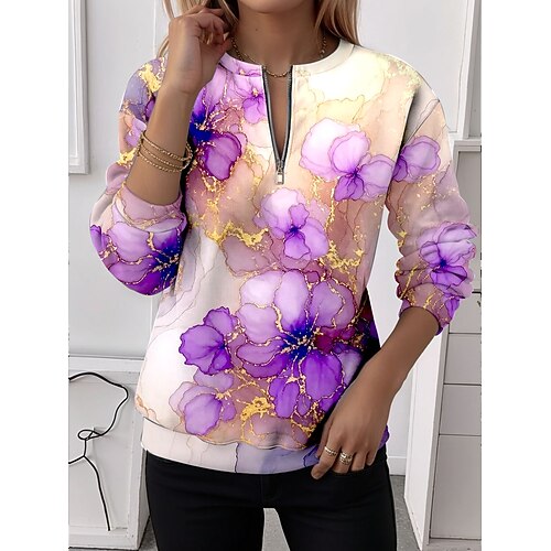 Per donna Felpe con cerniera Floreale Grafico Moda Casual Manica Lunga Girocollo Top Regolari Streetwear Abbigliamento Quotidiano Cerniera Stampato Bianco Viola Arancione Verde Primavera Autunno