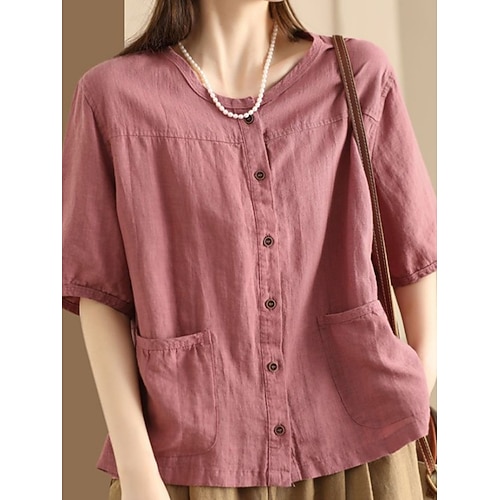 Per donna Blusa Semplice Elegante Casual Mezza Manica Girocollo Top Regolari Quotidiano Tasca Bottoni Nero Bianco Rosa Verde Cachi Estate Primavera