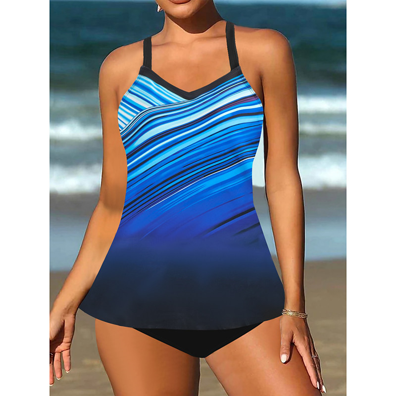 Women's Tankini 2 Piece Swimsuit Cheeky Tummy Control High Waist Slim Backless Vacation Beach Wear Ombre U Neck Sleeveless Bathing Suits