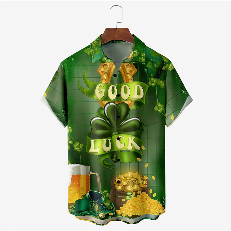 St.Patrick's Day Four Leaf Clover Casual Men's Shirt Outdoor Street Casual Daily Summer Turndown Short Sleeve White Dark Green Green S M L