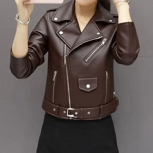 Per donna Giacca in Ecopelle Giacca da Biker Caldo Confortevole Cerniera Tasca Casual Tinta unica Vacanza Streetwear Casuale Abbigliamento quotidiano Corto Collo ripiegato Vestibilità regolare Manica