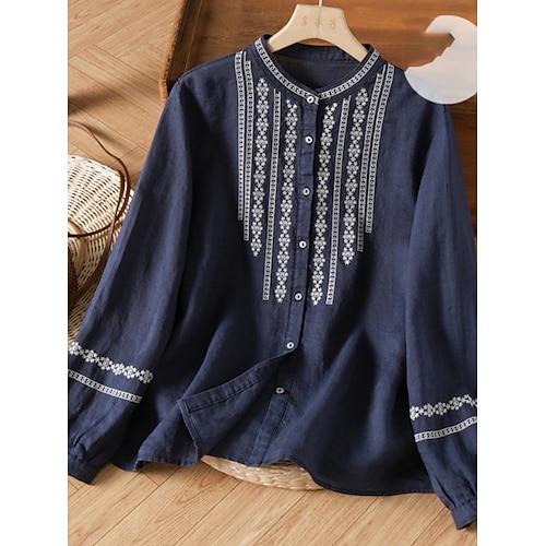 Per donna Blusa Tinta unica Elegante Casual Manica Lunga Collo alla coreana Top Regolari Quotidiano Ricamato Bianco Rosa Blu marino Arancione Primavera Autunno