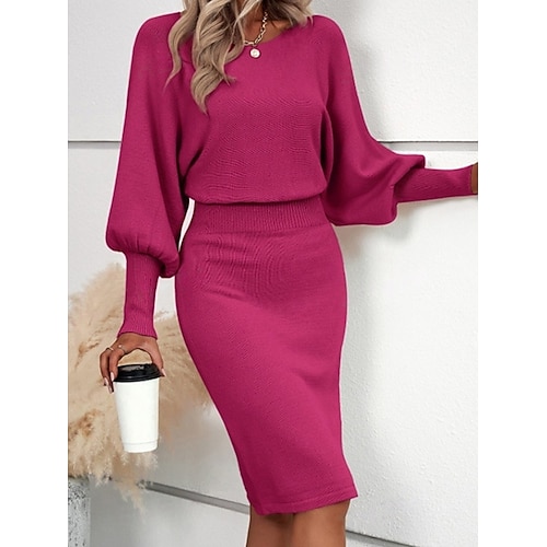 Damen Pullover Pullover Kleid Lässig Weich Einfarbig Gerippt Rundhalsausschnitt Gestrickt Langarm Lange Oberteile Stricken Outdoor Täglich Wochenende Schwarz Fuchsie Herbst Winter