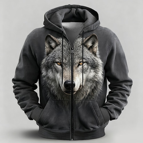Per uomo Lupo 3D Felpa con Cappuccio Giacca di pelle Felpa Fantasia Stampa su tutta la superficie Con cerniera Vacanza Uscire Abbigliamento casual alla moda Nero Cachi Grigio scuro Cerniera Autunno