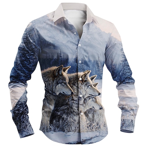 Per uomo Animale Lupo chiaro di luna Camicia Camicia con Bottoni Manica Lunga Vintage Retrò All'aperto Casuale Caccia Primavera Autunno Collo ripiegato Stampa 3D camicie con colletto Blu Blu chiaro