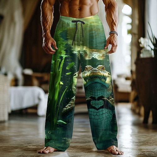 Herren Herz Tiermotiv Krokodil Hose Baggy-Hosen Freizeithose Mittlere Taille Lustig Outdoor Urlaub Elastischer Kordelzug in der Taille Leinenähnliche Hose mit Taschen Frühling Herbst 3D-Druck Grün