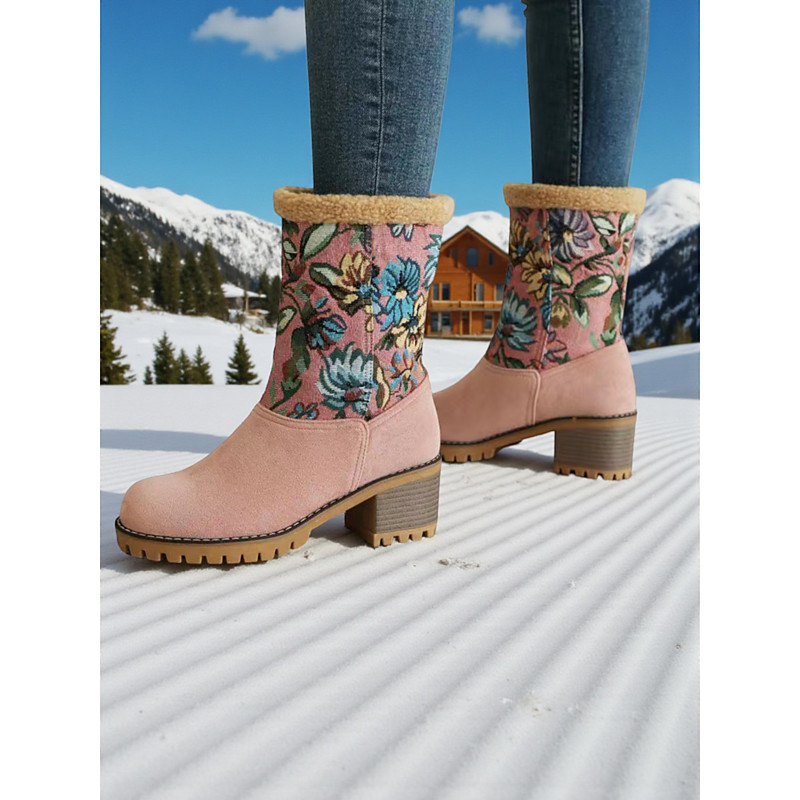 Women's Warm Ankle Boots with Faux Shearling Cuff and Floral Knit Detail - Non-Slip Chunky Heel Winter Shoes for Casual Cold-Weather Outfits