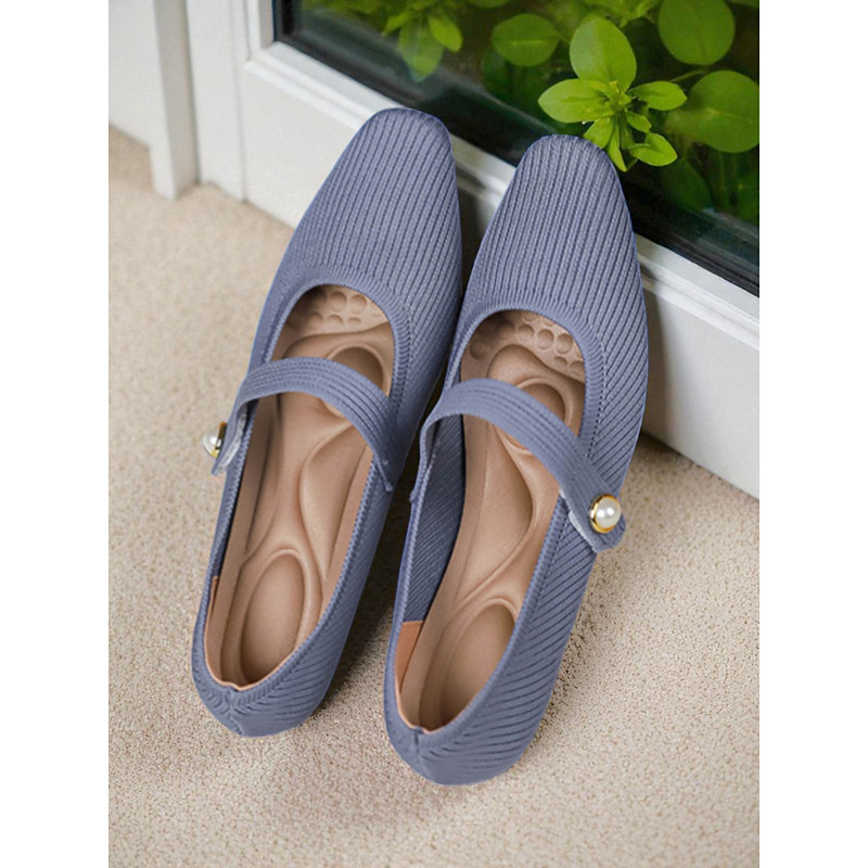 Women's Beige Knit Mary Jane Flats with Pearl Strap - Lightweight Breathable Casual Shoes for Daily Wear,Travel and Office Outfits