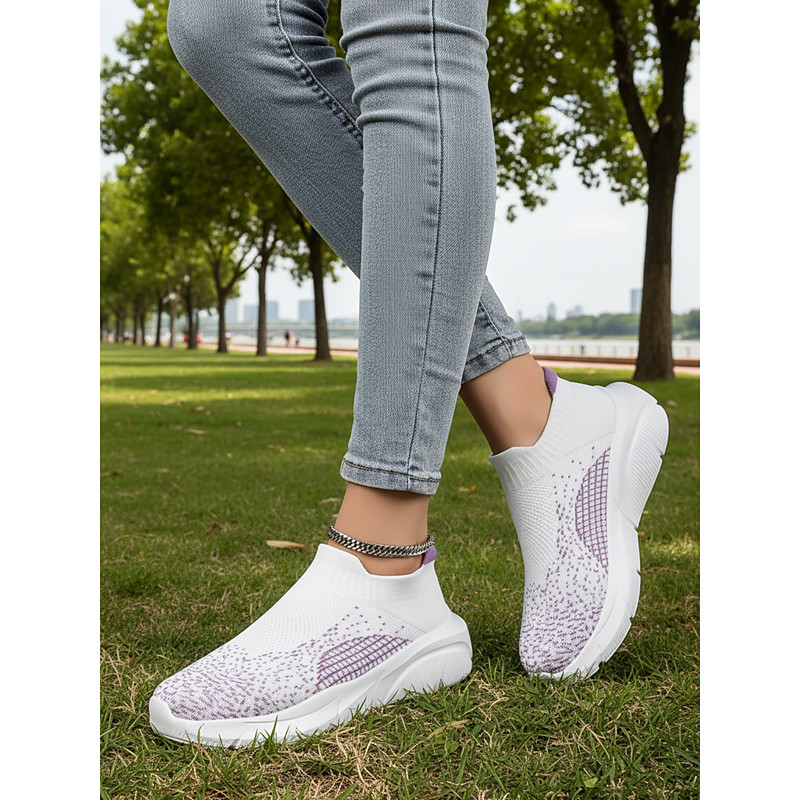 Women's White/Purple Slip-On Flyknit Walking Sneakers with Cushioned Platform – Soft Breathable Knit Shoes for Running, Daily Walking, Travel, Errands and Leisure