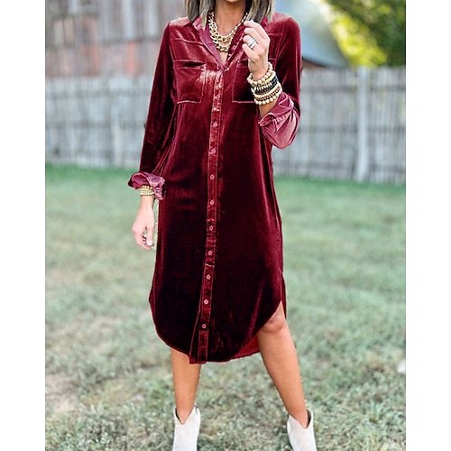 Per donna Abito Midi Abito in Velluto Abito Camicia Moderno All'aperto Vacanza Uscire Vestibilità regolare Semplice Manica Lunga Colletto a Camicia Nero Vino Verde militare Primavera Autunno