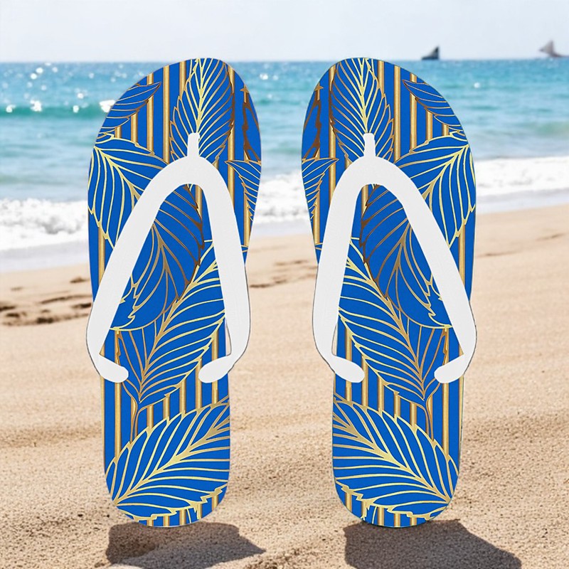 Men's Blue Leaf Printed Flip Flops – Tropical Stylish Style for Beach Vacations, Island Hopping Beachside Dinners