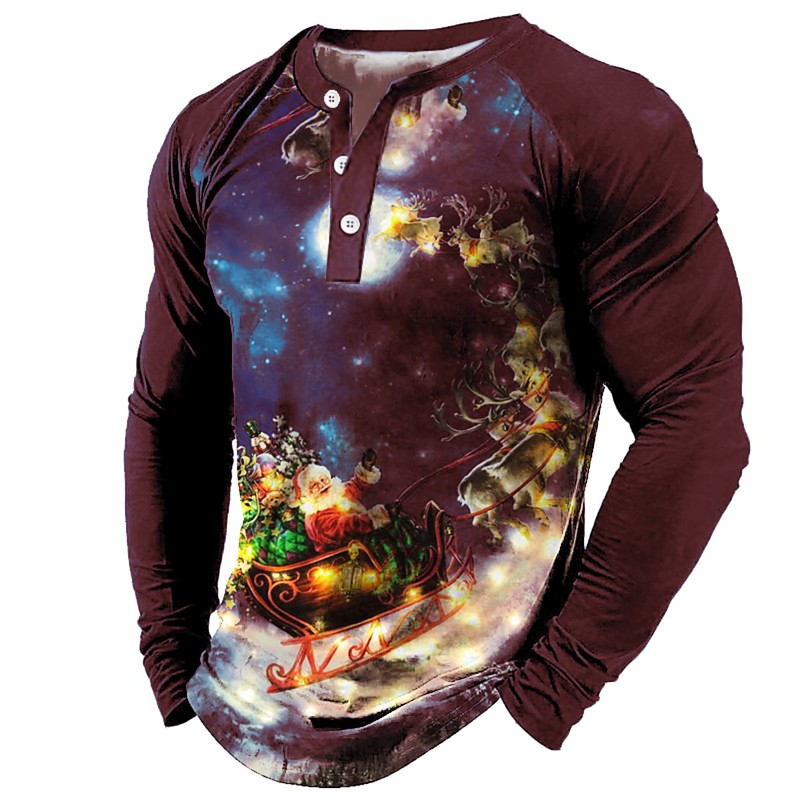 Christmas Men's Santa Claus Henley T Shirt Henley Tee Tee Graphic Santa Claus Henley Sea Blue Green Black Blue Purple 3D Print Outdoor Long Sleeve Patchwork Button-Down Clothing Apparel Basic