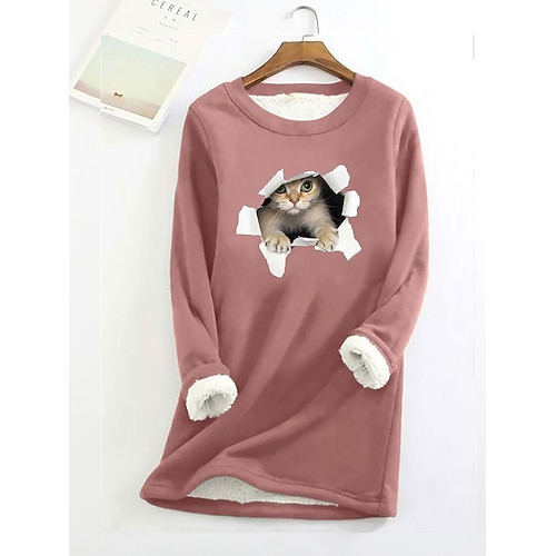 Damen Sweatshirt-Pyjama mit Fleecefutter Katze Warm Flauschig Langarm Rundhals Rundhalsausschnitt Lange Oberteile Lässig Sport Schwarz Gelb Rosa Dunkelpink Rote Herbst Winter