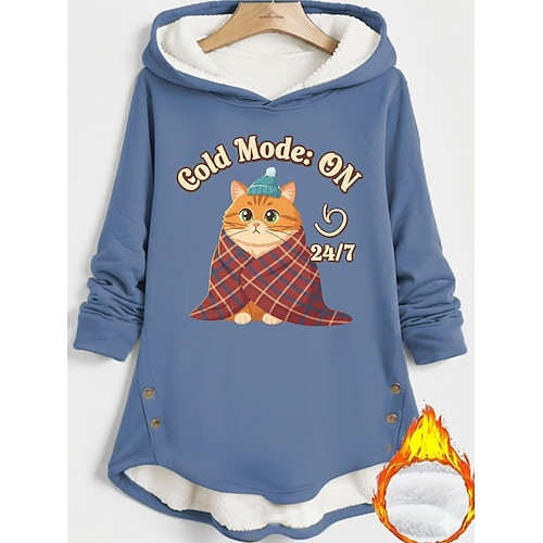 Damen Kapuzenpullover Katze Buchstabe Warm Lässig Langarm Mit Kapuze Lange Oberteile Straße Alltagskleidung Ferien Knöpfe Druck Schwarz Dunkelpink Blau Grau Herbst Winter
