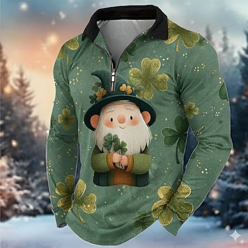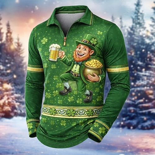 Giorno di San Patrizio Per uomo Trifoglio Elfo Polo Manica Lunga Collo ripiegato Moderno Tempo libero Casual Quotidiano Festival Cerniera Stampa 3D Primavera Autunno Verde