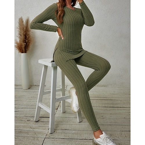 Per donna Moda Essenziale Set da due pezzi Maglietta Set di Pantaloni Manica Lunga Scollo a V Tinta unica Casuale Quotidiano Lavoro Nero Bianco Verde militare Primavera Taglia piccola