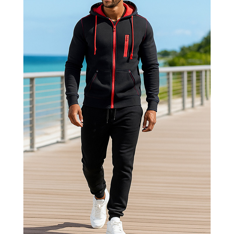 Men's Matching Sets Black Hoodie Sweatshirt Zip Up Hoodies Sweatpants Joggers Trousers Sets Long Sleeve Hooded Outdoor Vacation Solid Color Zip Up 2 Piece Polyester Spring