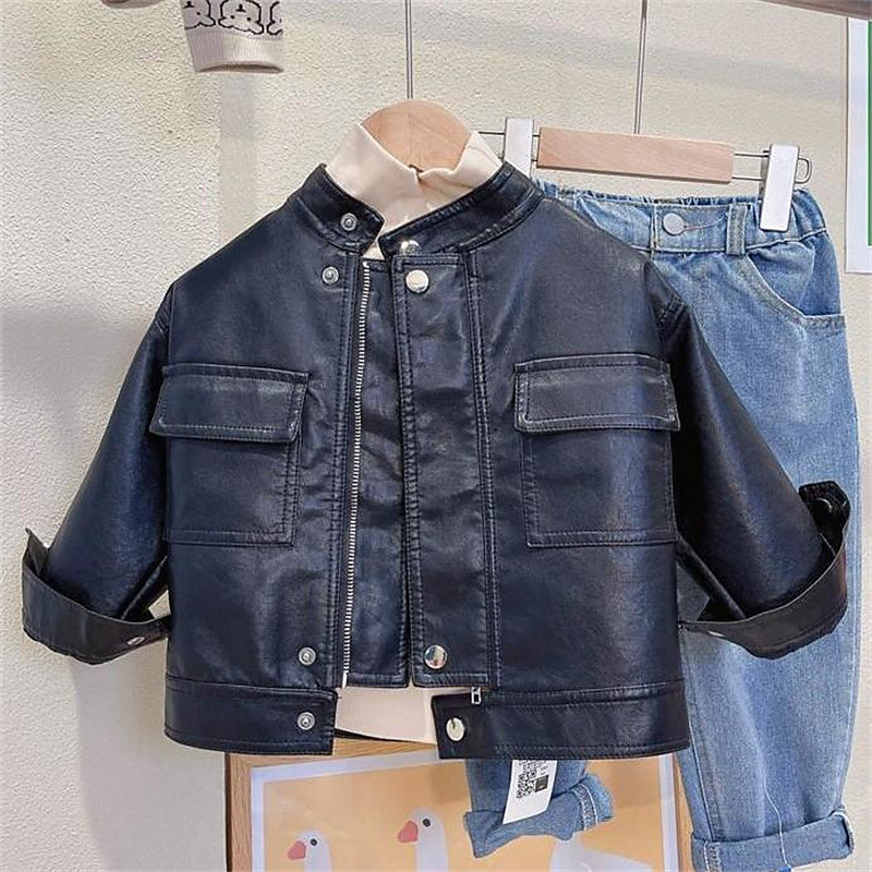 Kid's Boys' Black Leather Jacket Jacket Outerwear Plain Long Sleeve Zip Up Waterproof Windproof Coat Daily Fashion Casual Black Brown Green Spring Fall 4-12 Years