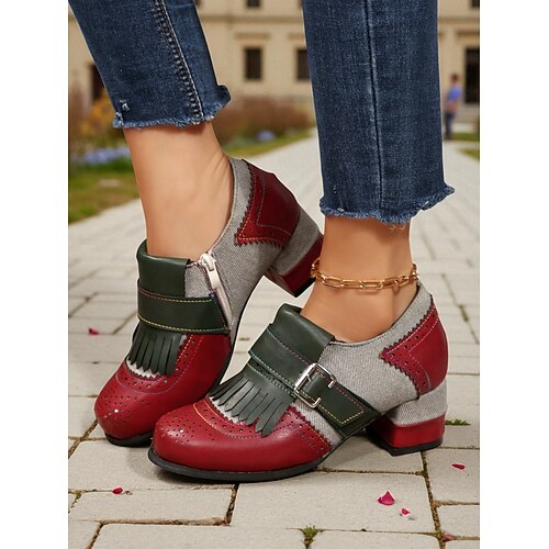 Scarpe stringate da donna in stile retrò anni '50 con tacco a blocco, cinturino a T e frange, design unico a blocchi di colore per uno stile casual, quotidiano e street.
