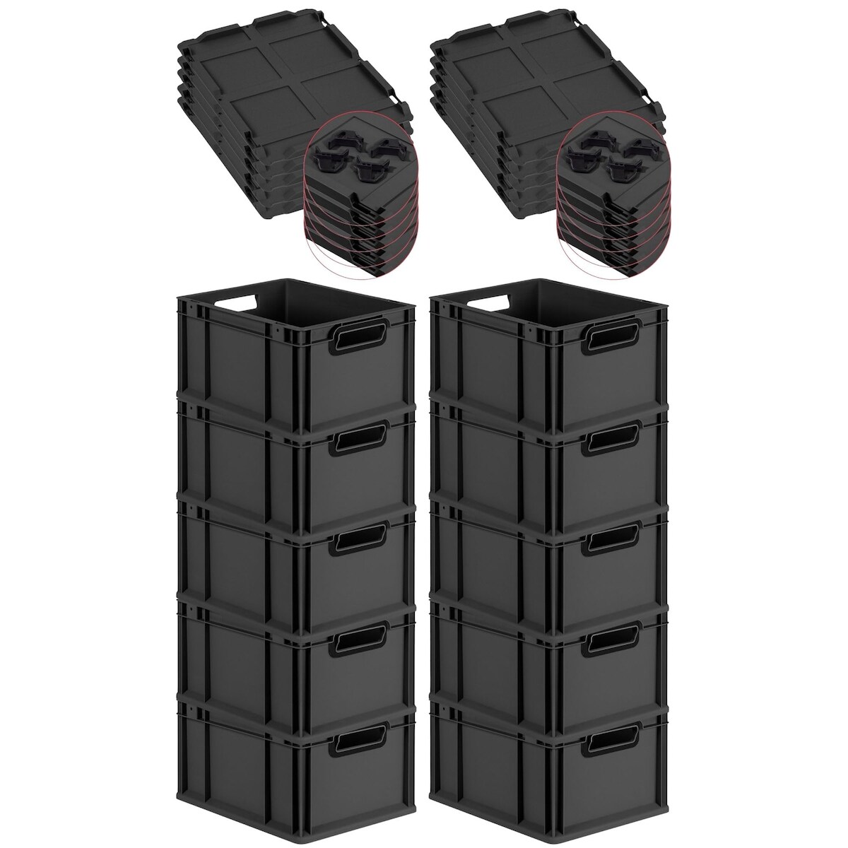 PROREGAL SparSet 10x Eurobox NextGen Color mit Auflagedeckel & Verschlüsse, HxBxT 22x30x40cm, 20L, Schwarz, Griffe schwarz offen, Eurobehälter