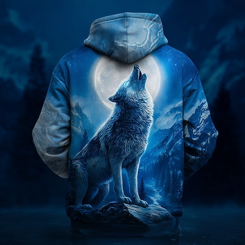 Per uomo MOON Lupo Felpa con Cappuccio Felpa 3D Fantasia Girocollo Abbigliamento casual alla moda Club Regalo Blu chiaro Blu 1 Blu 3# Blu 2# Coulisse Autunno Inverno progettista S M L XL XXL XXXL