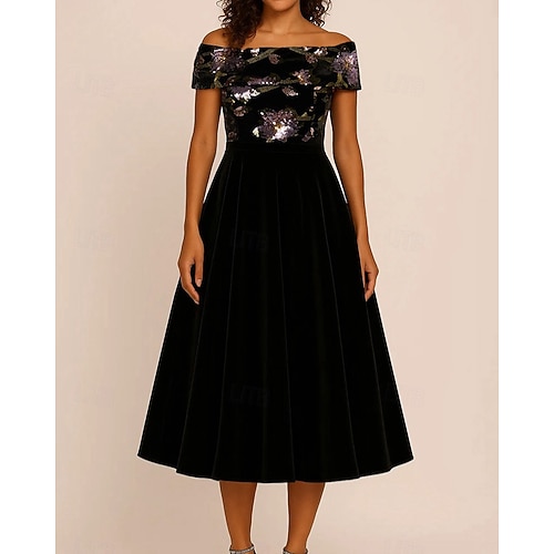 Abito da Festa Knee Length A-Line Abito da Cocktail Abito per Ospite di Matrimonio Abito Madre della Sposa Maniche Corte Spalle Scoperte Elegante Vintage Festa con Colore Solido