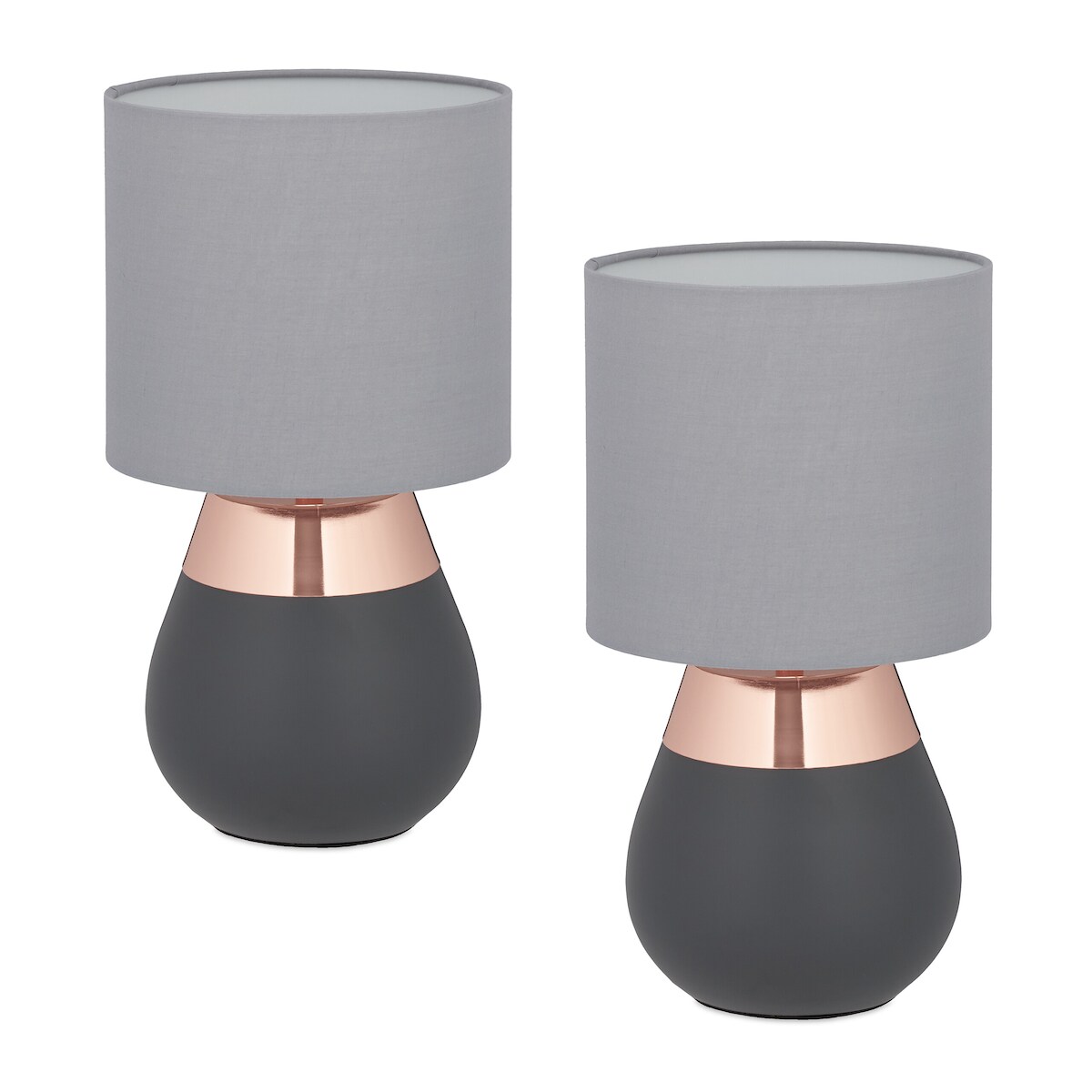 Relaxdays Tischlampe, 2er Set, Metallfuß, Stoffschirm, E14, H x D: 32 x 18 cm, Nachttischlampe mit Kabel, grau/kupfer