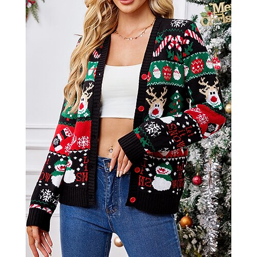 Per donna Felpa Cardigan Streetwear Casual Grafico Scollo a V Bottoni Lavorato a maglia Stampato Manica Lunga Top Regolari Maglia Natale Quotidiano Ferie Nero Rosso Autunno Inverno