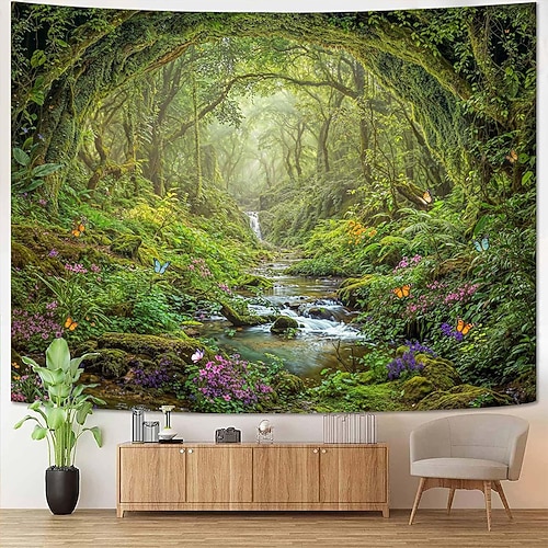 Arazzo da parete con tema foresta naturale, raggi di sole che filtrano tra gli alberi, paesaggio da appendere al muro, bosco nebbioso, pineta muschiosa, grande poster in tessuto per camera da letto,