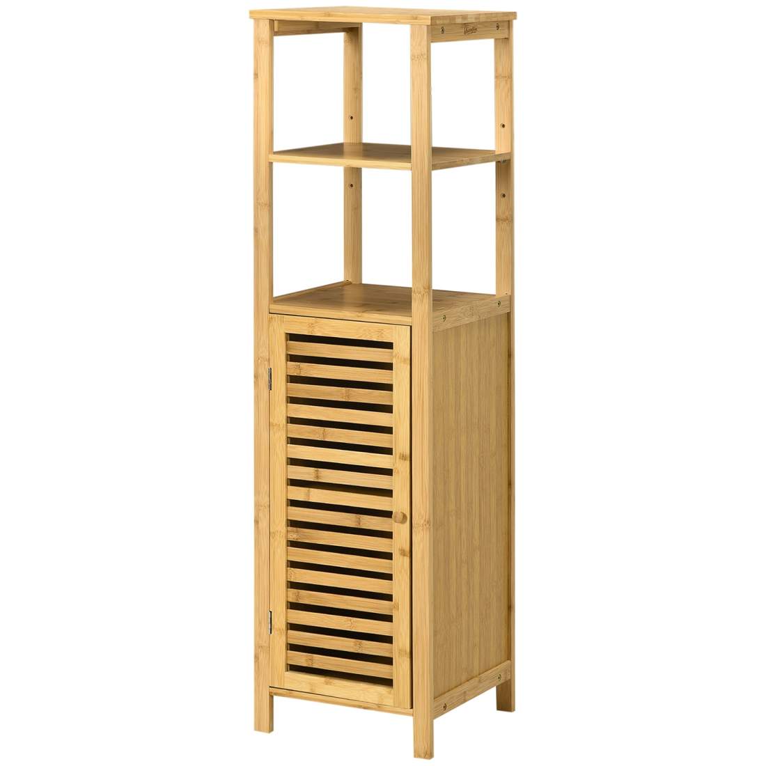 Høydejusterbart baderomsskap, baderomsskap av bambus, baderomsmøbel med skap, to åpne hyller, til bad, ca 33 x 30 x 120 cm natur