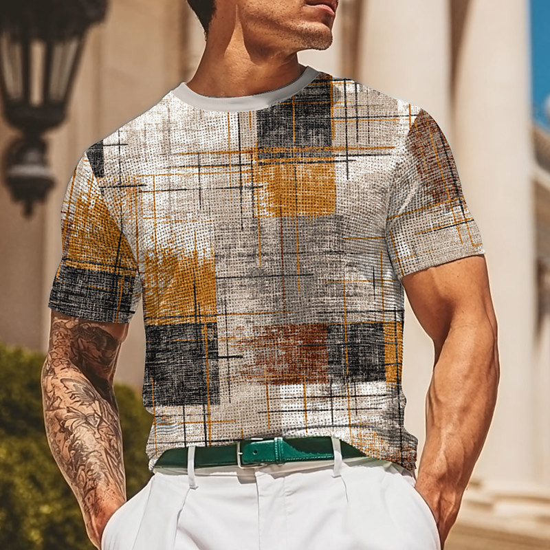 Men's Plaid Line Waffle Shirt Short Sleeve T shirt 3D Print Crew Neck Shirt Fashion Casual Comfortable Street Casual Daily Red Blue Brown Summer Spring All Seasons Clothing Apparel S M L XL XXL XXXL