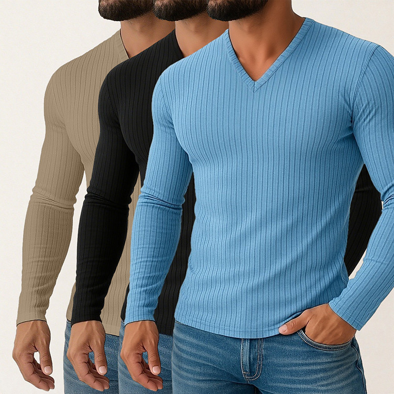 Men's T Shirt Muscle Shirt Ribbed Knit tee Tee Top Long Sleeve V Neck N / A Plain Pit Strip Basic Knitting Home Casual Daily House Light Blue Black White Top Tee for Men