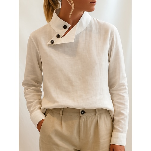 Per donna Camicie di cotone e lino Tinta unica Essenziale Casual Manica Lunga Collo Alto Top Regolari Quotidiano Bottoni Blu Viola Arancione Cachi Grigio Estate