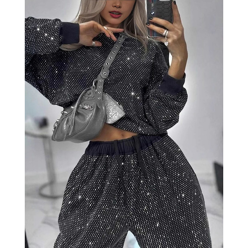Women's Active Fashion Streetwear Pants Sets Bolero Top Long Sleeve Crew Neck Solid Color Sequins Outdoor Vacation Daily Black Fall Regular Fit
