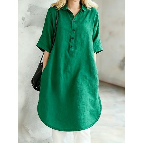 Per donna Abito Midi Finto cotone e lino Abito a Tubino Casual Quotidiano Vestibilità comoda Semplice Mezza Manica Bavero Giallo Rosso Viola Verde Estate Primavera Autunno