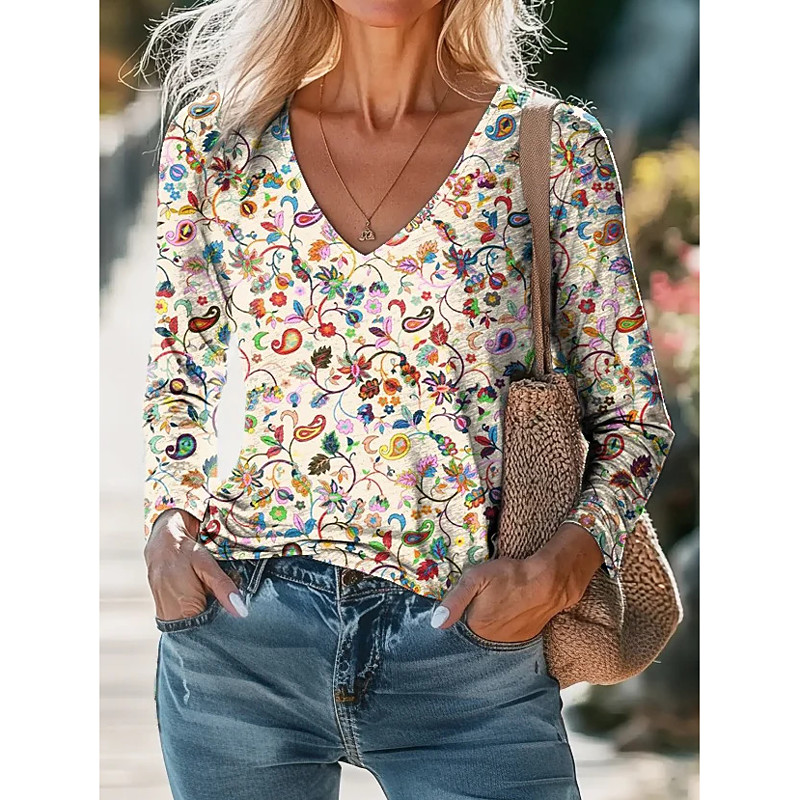 Women's Blouse Floral Bohemia Daily Long Sleeve V Neck Regular Tops Daily Holiday Print Black White Purple Green Apricot Summer Spring Fall