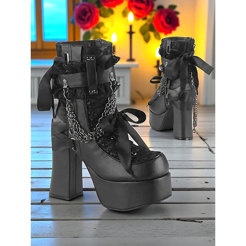 Women's Gothic Platform Lace-Up Boots – Black and Red High Heel Ankle Boots with Chains and Lace Trim for Punk Rock, Halloween Cosplay Outfits