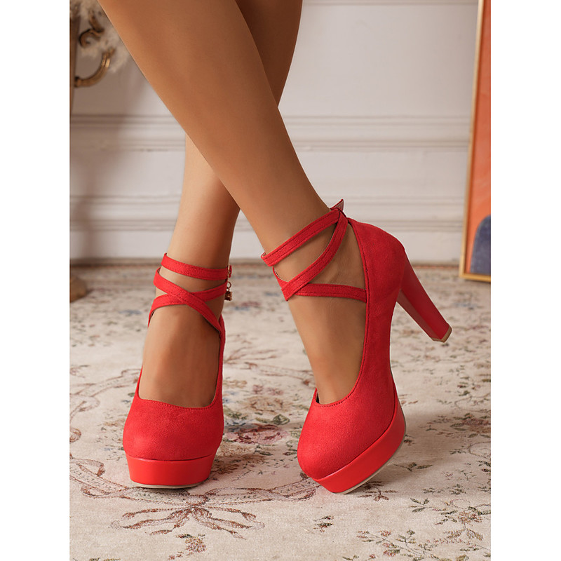 Women's 1950s Red Suede Platform Pumps with Ankle Strap and Crystal Charm – Stylish High Heel Shoes for Evening Parties and Formal Occasions