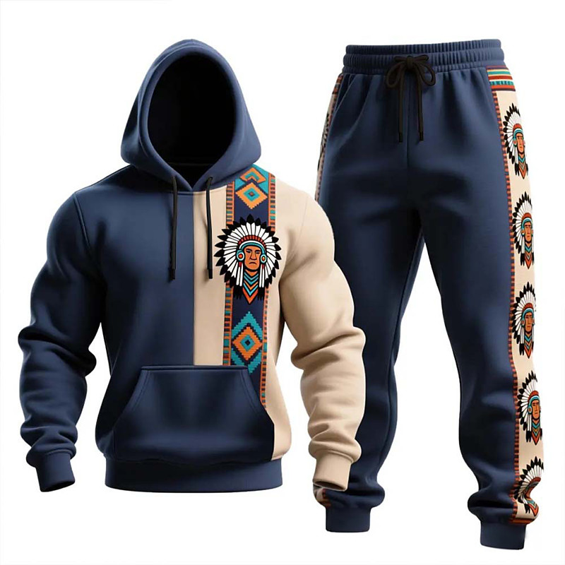 Men's Geometic 2pcs 3D Sweatshirt Sets Hoodie Sweatshirt Long Sleeve Long pants Hooded Ethnic Style Casual Daily Athleisure 3D Print Ethnic Spring Fall Winter Blue