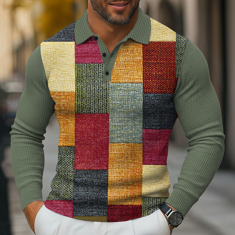 Men's Color Block Geometic Waffle Polo Shirts Long Sleeve Polo Shirts Collared Shirts Business Casual Business Wear to work Daily Wear 3D Print Buttons Spring Fall Winter Red 1 Red 4 Red 3