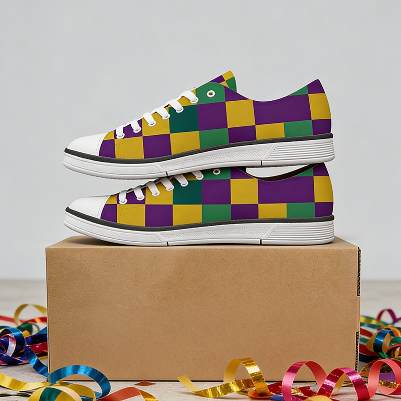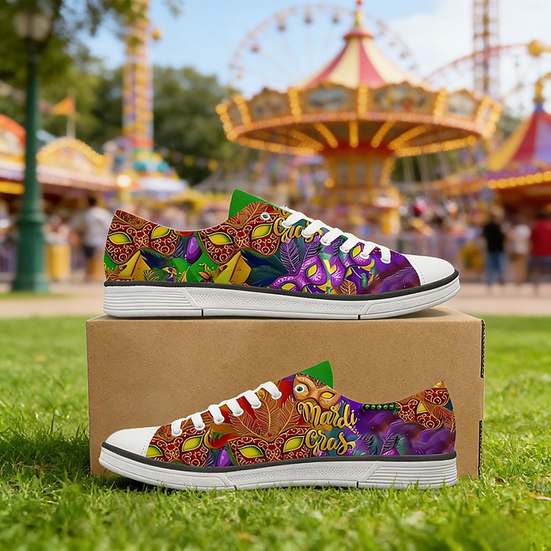 Men's Carnival Ribbon Print Lace-Up Sneakers, Classic Low-Top Casual Canvas Shoes for Mardi Gras, Street Festivals, Parades, Travel and Everyday Wear