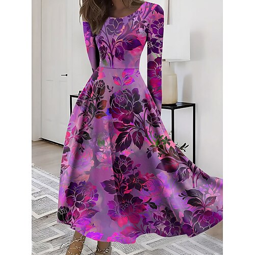Per donna Abito Midi Vestito Casual Vestito a ruota Elegante Moda Quotidiano All'aperto Weekend Vestibilità regolare Grafico Manica Lunga Girocollo Viola chiaro Viola Fucsia Verde Primavera Autunno