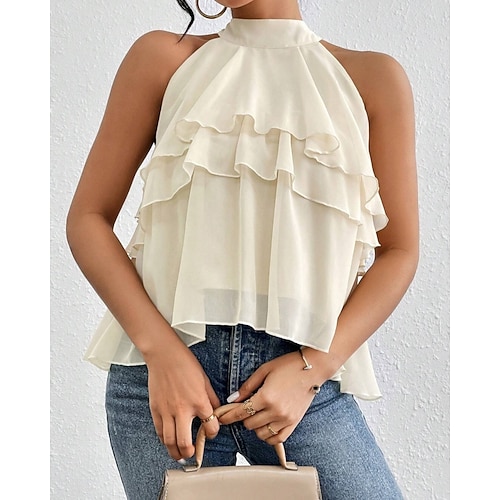 Damen Tank Top T-Shirt Einfarbig Elegant Mode Ärmellos Hoher Ausschnitt Normale Oberteile Täglich Ausgehen Wochenende Rüsche Schwarz Marineblau Himmelblau Purpur Grün Sommer Frühling