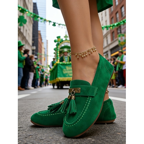 mocassini con nappe verdi da donna: calzature classiche e alla moda per il giorno di San Patrizio, adatte a sfilate, festival, feste e all'uso quotidiano