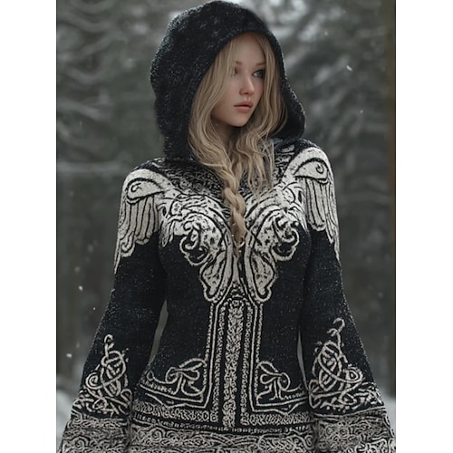 Damen-Wikingerpullover im Vintage-Stil mit Kapuze, coolem geometrischem Print, langen Ärmeln, normaler Passform, Strickoberteil, Outdoor-Stil, Alltag, schwarz, Herbst/Winter
