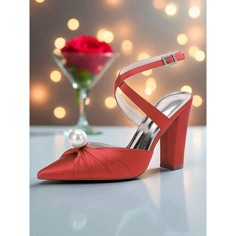 Women's Blue Satin Block Heel Pumps with Pearl Detail and Ankle Strap - Elegant Pointed Toe Shoes for Formal Occasions and Cocktail Parties